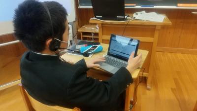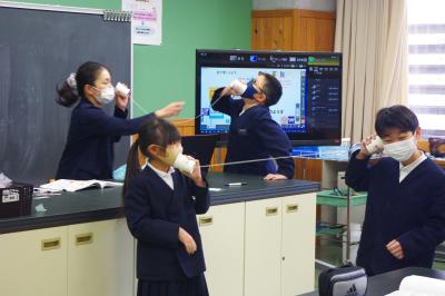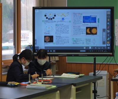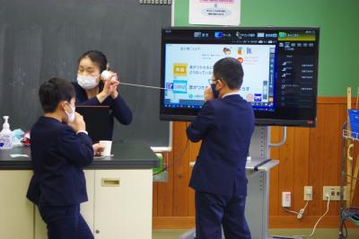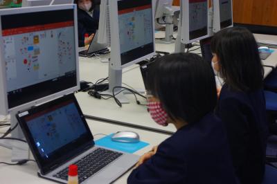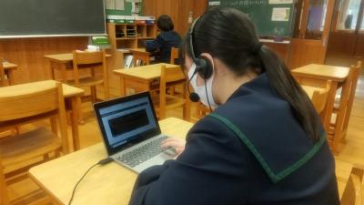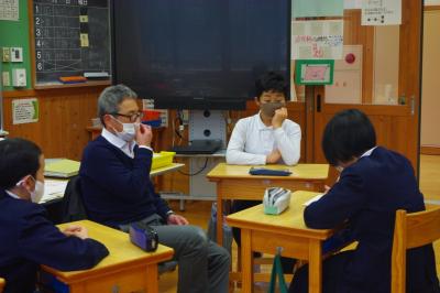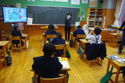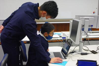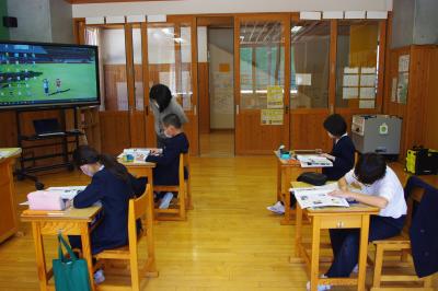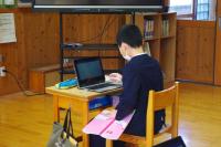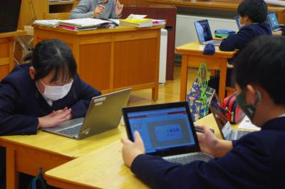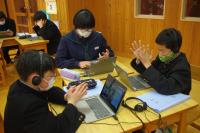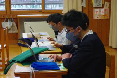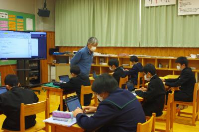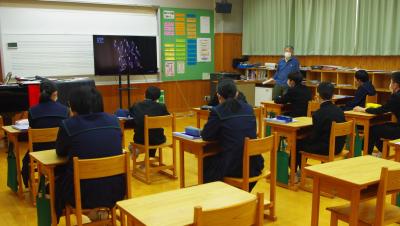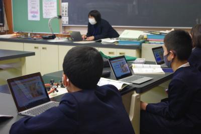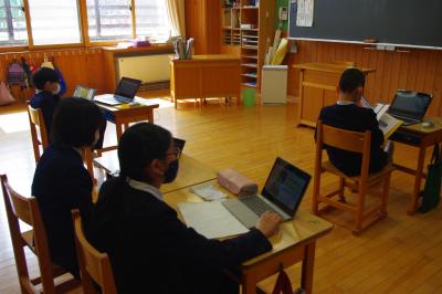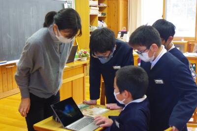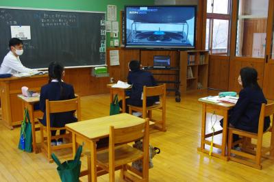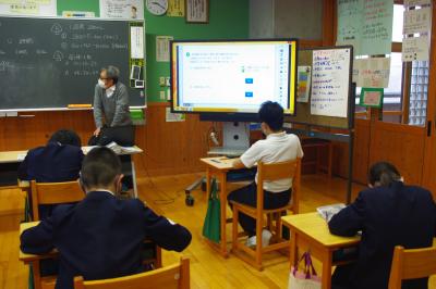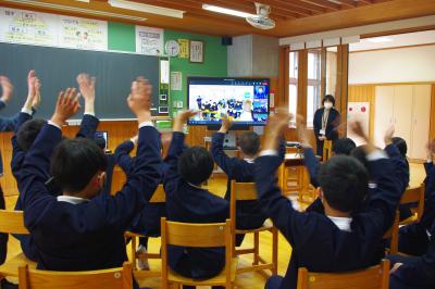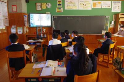 沖縄県うるま市の津堅小中学校とオンライン交流を行っています。津堅小中学校は本校と同じ小中併設校です。