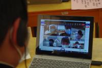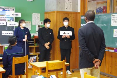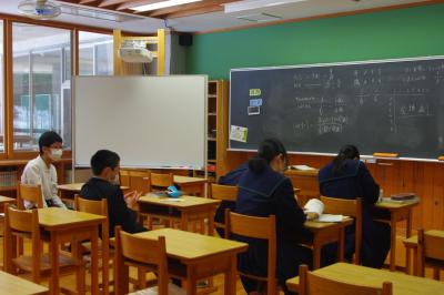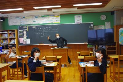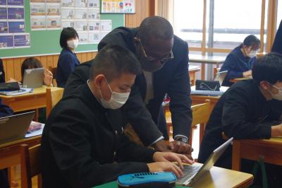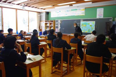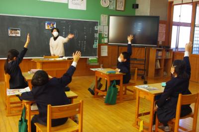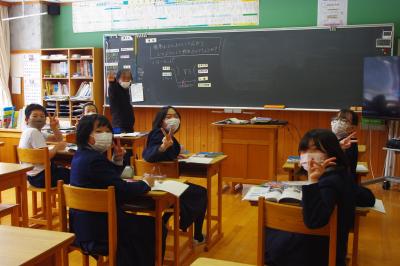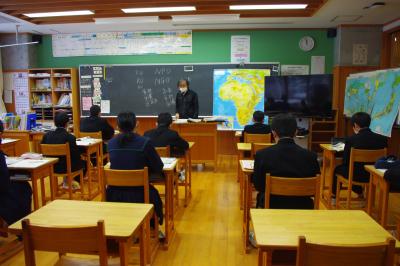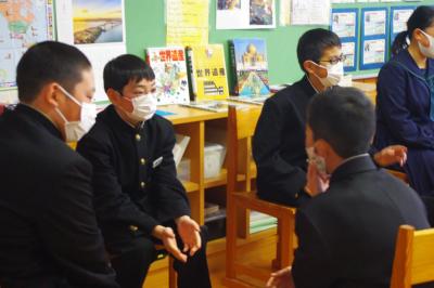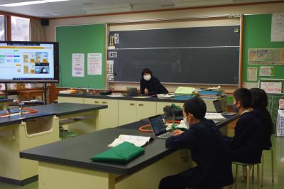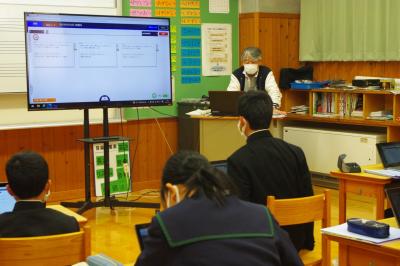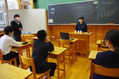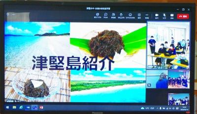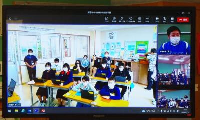 津堅小中の先生が、今年1月のうるま市中学生と本校との交流事業で来校したことをきっかけ、ぜひオンライン交流をというお誘いをいただき、本日に至っています。
