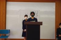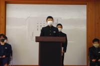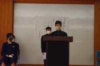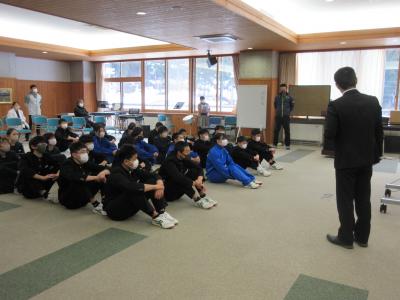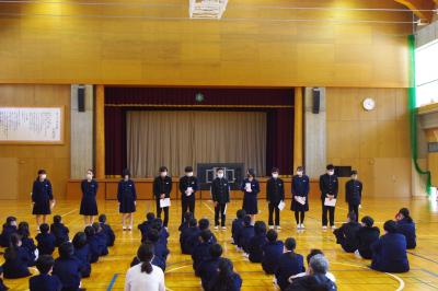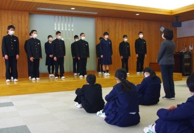 鶴来総合文化会館クレインにて、全国中学校スキー大会や中部日本スキー大会等に出場する選手の市激励会に本校生徒も参加しています。本校生徒が選手代表として、市教育長にお礼の言葉を述べています。