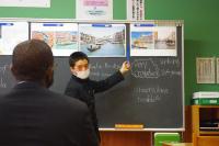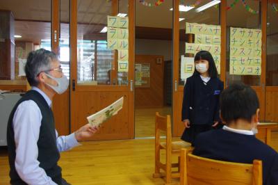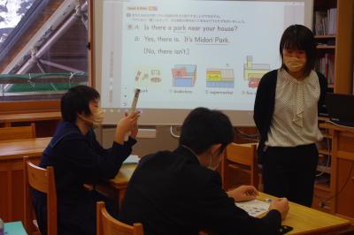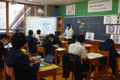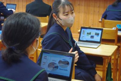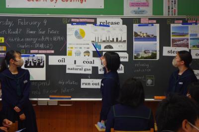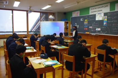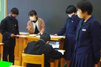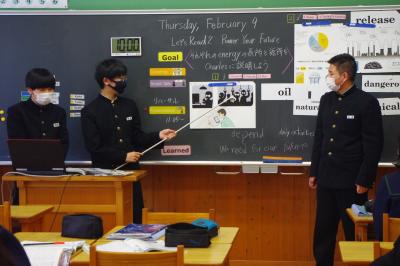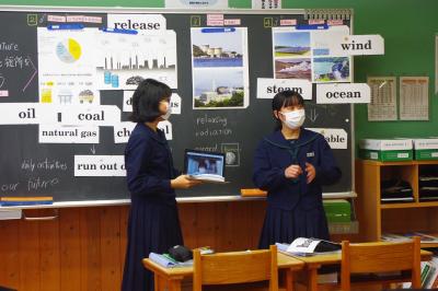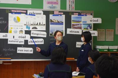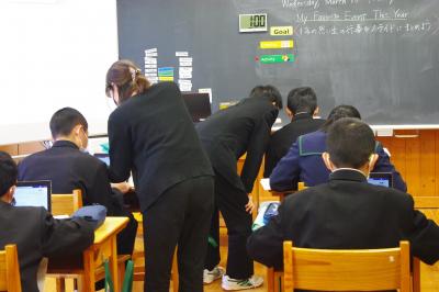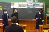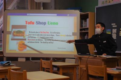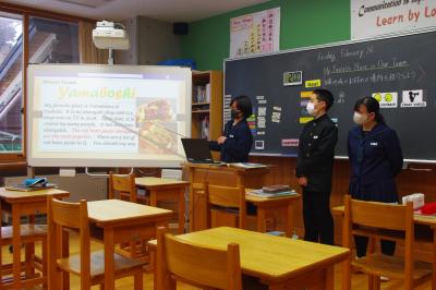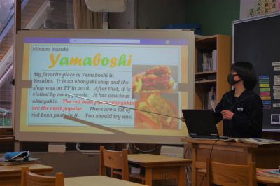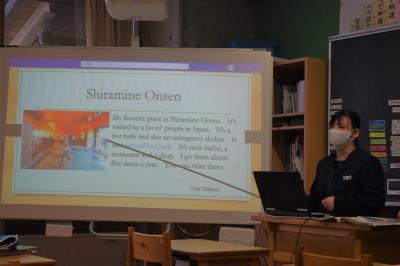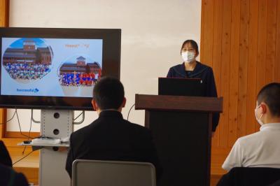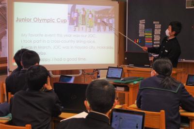 英語 この1年間で印象に残った学校生活の出来事について、クラスメイトに英語で紹介しています。先生たちも聞きに来ています。