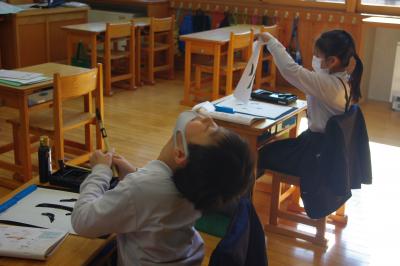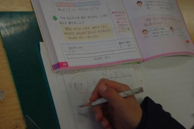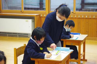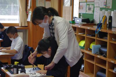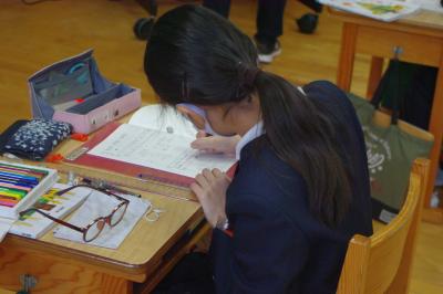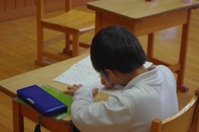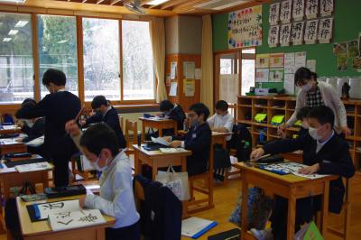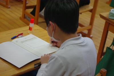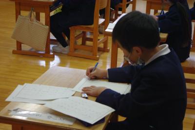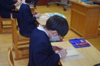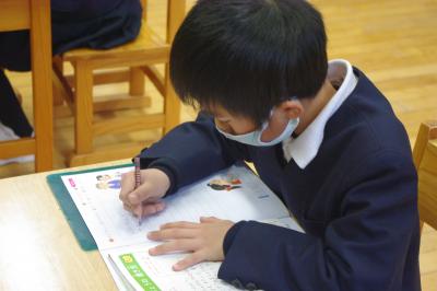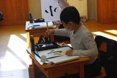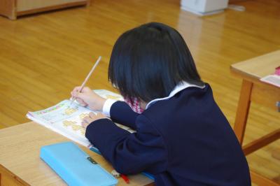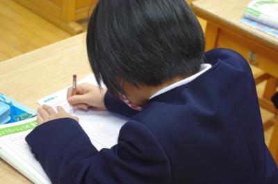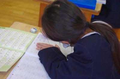 書写 背筋を伸ばし、とめや払いに気をつけるなど、これまで習ったことを意識し、集中して書いています。