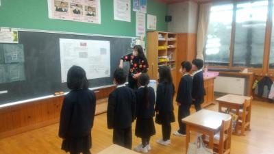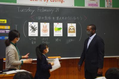 外国語活動 生活に関わる英語を使っています。チャールズ先生のジェスチャーが何を表しているのか、英語で答えています。 例えば、wash my face など。