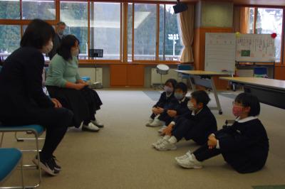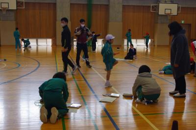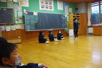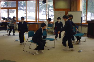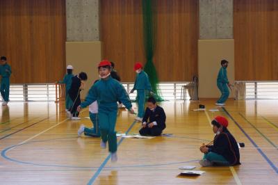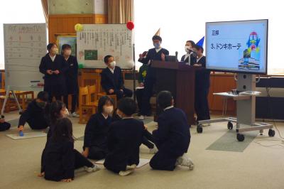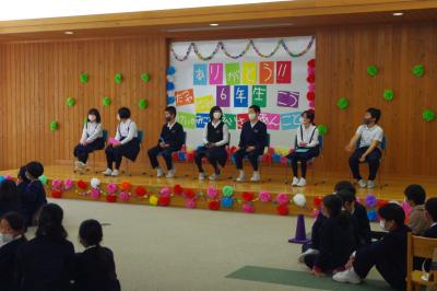 お楽しみパーティーを行っています。いすとりゲームやなわとびなど、児童が役割分担し進行を行っています。