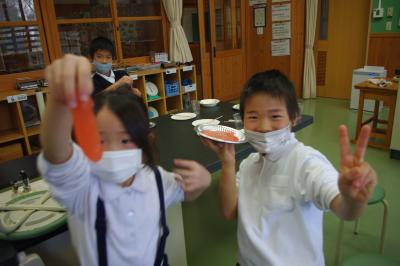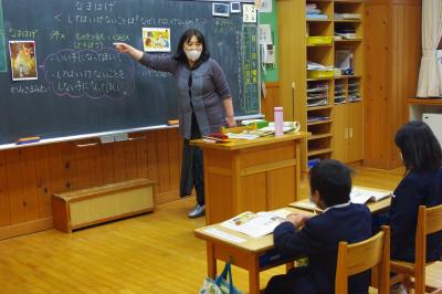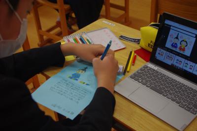 道徳 働くことについて考えを交流させています。外に遊びに行こうとしたら、母にみかん出しの仕事を手伝ってほしいと言われ、いやいや仕事をしていましたが、ふとしたことからみかんに色や形を見つけて、自分なりに楽しみながら仕事をし、あっという間に終わらせたというお話から、働くことについて考えています。