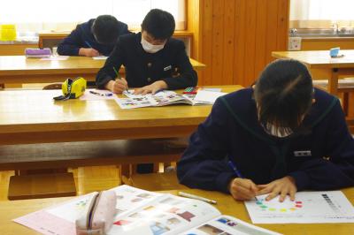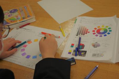 美術 色について学んでいます。例えばサッカーのイエローカードように、言葉を介さなくても色で意味を表現できるなど、色の意味についても学んでいます。