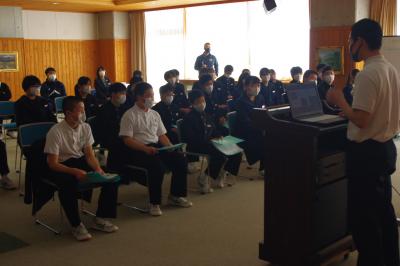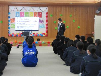 月に1回、全校集会にて先生が10分間話をします。今日は、水球で大学チャンピオンになった先生のお話です。レギュラーになれず、ストレス発散もできず2ヶ月で15kg痩せた経験から、自分に合ったストレス発散方法を知ること、さらには自分で自分をいたわることや自分自身を知ることの大切さについて、話を聞いています。