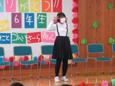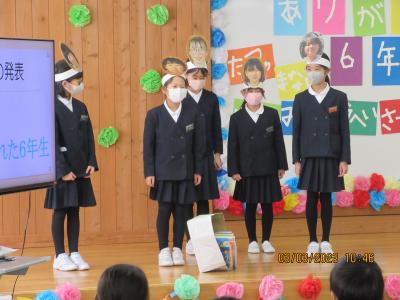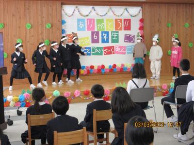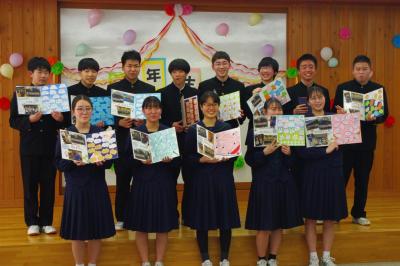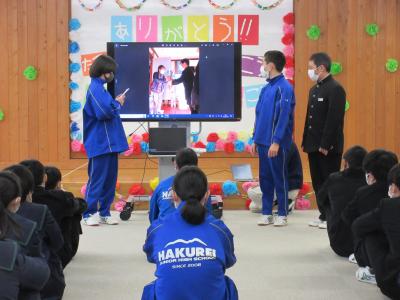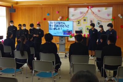 中学校3年生を送る会 1年生はクイズを企画し、2年生は制作した思い出ビデオを放映しています。小学校時代にお世話になった先生からもたくさんメッセージを頂いています。