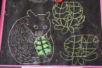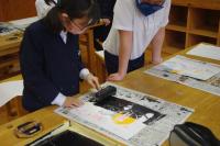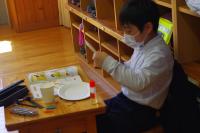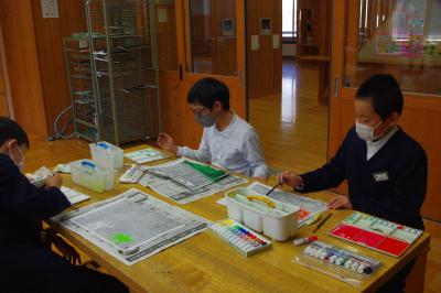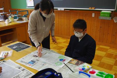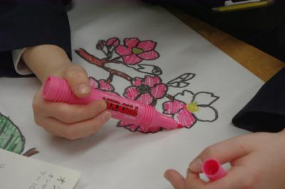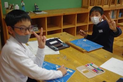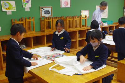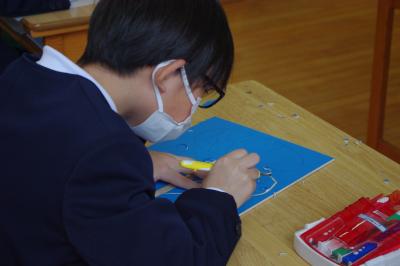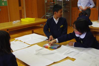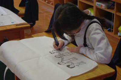 図工 バッグに自分の好きな物、花や昆虫などを描いています。布の下に原画を置き、輪郭をなぞった後、色を塗っています。