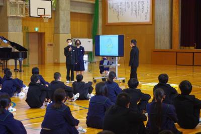 沖縄県うるま市の中学2年生代表団と本校児童生徒との交流会を行っています。うるま市の生徒の皆さんからは、沖縄やうるま市に関する歴史、文化、食べ物、方言などについて説明してもらっています。白嶺中の2年生も、今年総合的な学習の時間に探求してきた自分の生き方について話をしています。