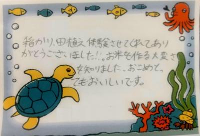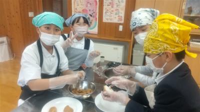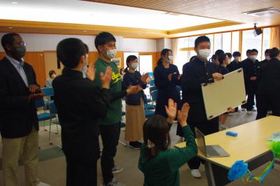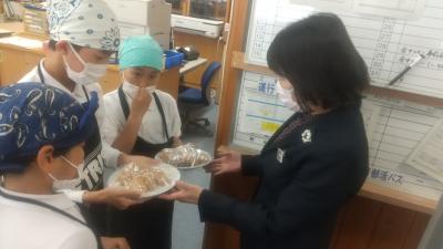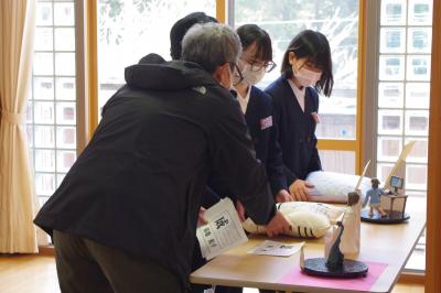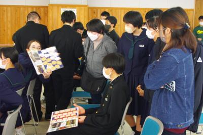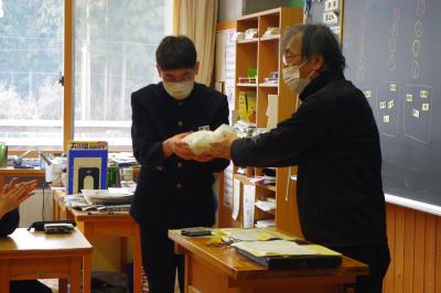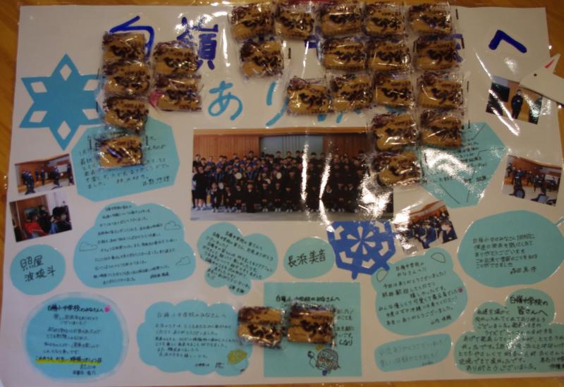 記念品交換では、本校から、白山市ジオパークと猫を合わせたキーホルダー「ジオパークのびねこ」と地元の堅豆腐とホワイトチョコレートを原料にしたクッキーを、うるま市からは、沖縄の砂と貝殻を使った手作りキャンドルと地元山芋を使ったお菓子をいただきました。