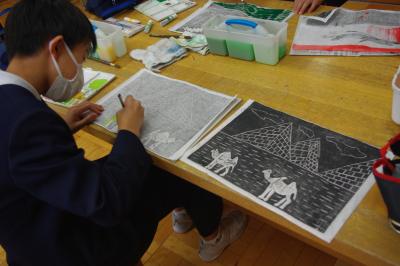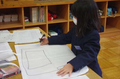 図工 作品バッグに絵を描いています。下書きを写したり、そのまま描いたりしています。