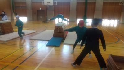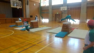 体育 跳び箱練習。段階に応じた高さや技に挑戦しています。上手な人は、足を開いて跳んでいます。