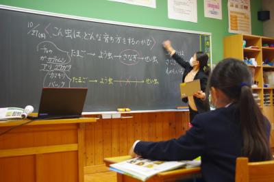 理科 昆虫はどんな育ち方をするのか、カブトムシや蝶などさなぎになる昆虫が多い中、コオロギやバッタなどさなぎにならない昆虫もいることを映像資料も使いながら学んでいます。