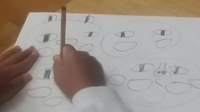 外国語 ハロウィンにちなんでモンスターの顔を描いています。チャールズ先生が出す体の部分や数のカードを元に描いています。楽しみながら英語に親しんでいます。