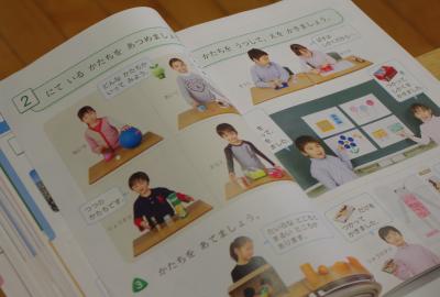 音楽 どんな楽器が歌と合うか、ウッドブロック、タンブリン、トライアングル、すずの中から選んで練習します。