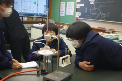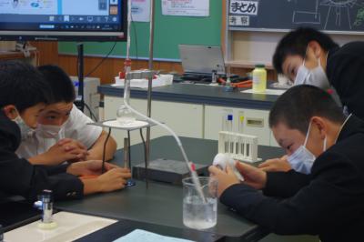 理科 水とエタノールの混合物から、エタノールを取り出す実験を行っています。