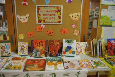 図書館前は、栗や芋など、秋の実りに関する本のコーナーを設けています。