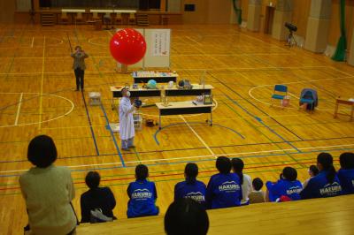 ベルマーク理科実験教室では、へそで茶を沸かしたり、送風機を使って大きな風船を空中にとどめたりと、空気に関する実験を、楽しみながら見たり体験したりしています。