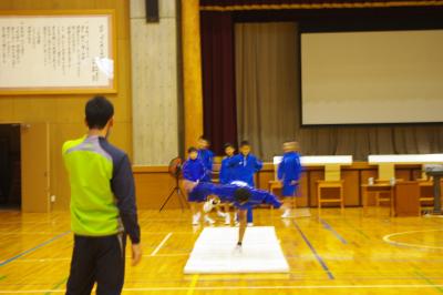体育 いろいろな技を盛り込んで、マット運動の発表を行っています。