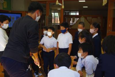 お楽しみ会 空手の型を披露しています。6年生も見学しに来ています。