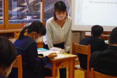 英語 教科書の本文をペアで読む練習をしています。流暢に読めています。