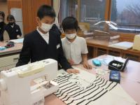 家庭 エプロン制作の仕上げとして、アイロンをかけています。