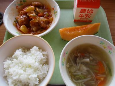 今日の献立は「ごはん、牛乳、酢豚、ワンタンスープ、メロン」です。