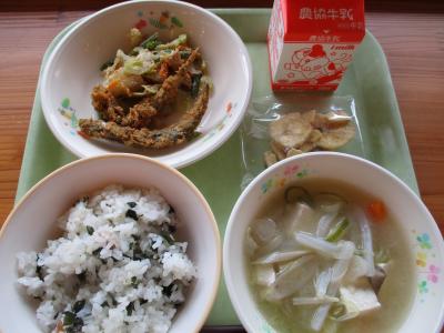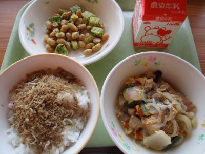 今日の献立は「ごはん、牛乳、手作りふりかけ、揚げ大豆とじゃがいもの磯和え、卵とじ」です。
