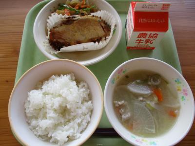 今日の献立は「ごはん、牛乳、魚のマヨネーズ焼き、こんにゃくのきんぴら、豚汁」です。