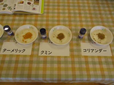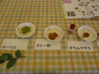 材料のカレー粉やガラムマサラと、一般的なカレーに使うスパイスをランチルームで展示しました。