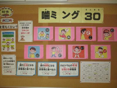 よく噛んで食べる事の良さは給食室前掲示板や、健康委員による給食時間の放送でも紹介してもらう予定です。