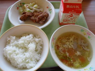 今日の献立は「ごはん、牛乳、スパイシーチキン、ジャーマンポテト、まっとうトマトとたまごのスープ」