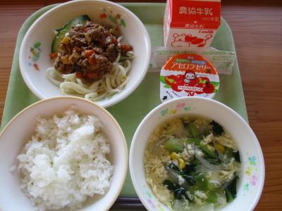 今日の献立は「ごはん、牛乳、ジャージャー麵、コーンかき玉スープ、アセロラゼリー」です。