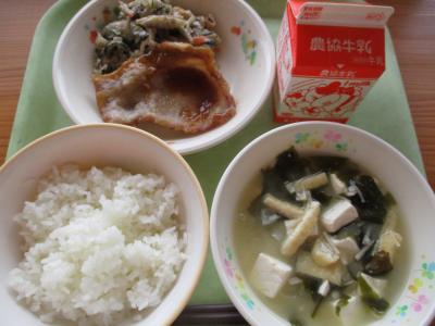 今日の献立は「ごはん、牛乳、ぶた肉のガーリックソース、ひじきとごぼうのサラダ、豆腐のみそ汁」です。