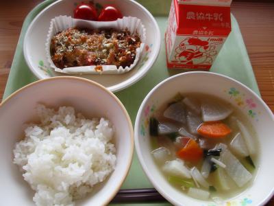 今日の献立は「ごはん、牛乳、ナスとピーマンのカレーグラタン、ミニトマト、大根のスープ」