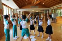 〈小学校〉運動会練習が始まりました。今日は1~6年生によるダンス練習の第1回目が行われました。「みんなに笑顔と勇気が届くようなキレのあるダンスをしよう」と実行委員の5・6年生が練習のめあてを全校のみんなに伝えました。さっそく、曲のサビの部分の振り付けを練習しました。