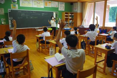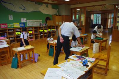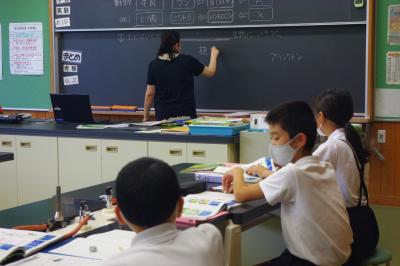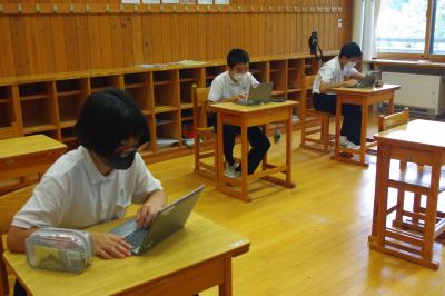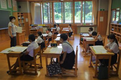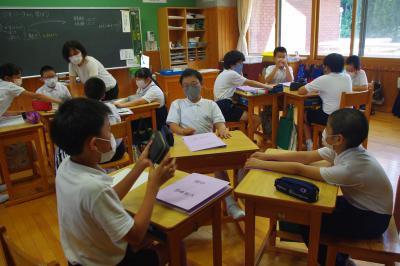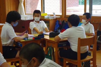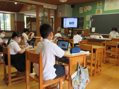 小学校の登校日です。夏休みの宿題を提出したり、読書感想文の下書きを書いたり、GIGA端末で撮影した夏の思い出を編集したりしています。