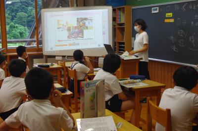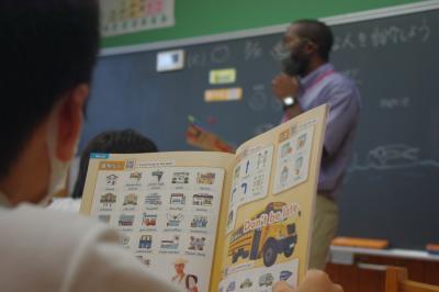 外国語 公園や図書館など身近な場所を英語で表現しています。チャールズ先生が発音した後に子どもたちもまねをして発音しています。