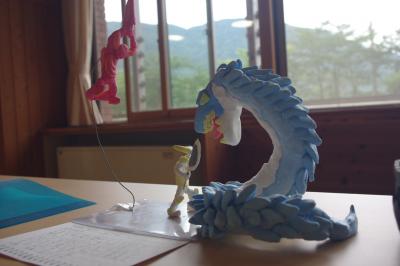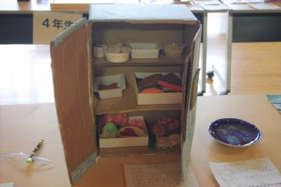 夏休みの作品を展示しています。小学校2年生の冷蔵庫や、小学校6年生の粘土作品など、意欲的で創意工夫に満ちた作品がたくさんあります。