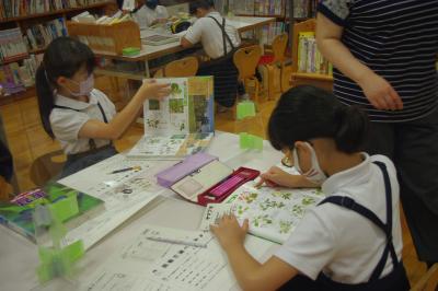 図書館の図鑑などを使って調べる方法を学校司書の先生からも学んでいます。聞いたことのない虫や植物を実際に図鑑で検索しています。