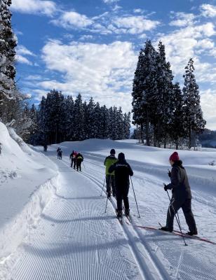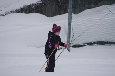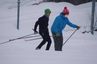 クロスカントリースキー体育 学校グランドでクロスカントリーを行っています。 クロスカントリースキーは、雪上に設営されたコースでスキーとスキーポールを使って走力を競う競技スキーです。先生だけでなく、地域のコーチの方々にも教えてもらいながら行っています。