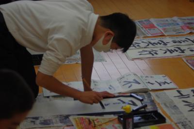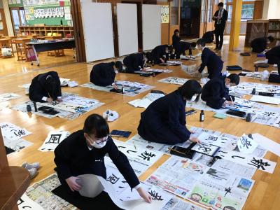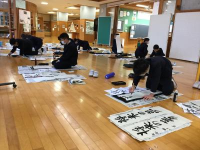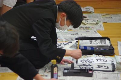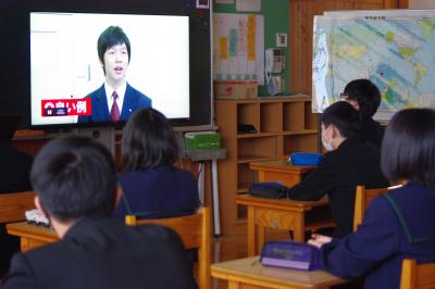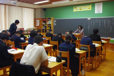 立志式 鳥越中学校の2年生と合同で立志式を行っています。本校の生徒が代表して市民憲章、立志の言葉を言っています。式の後、講演会も行われます。