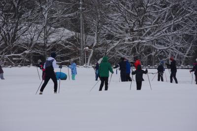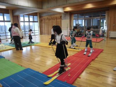 体育 体育でスキーをするため、スキーの板が重ならないようにして歩く練習をしています。