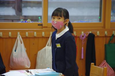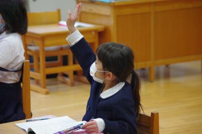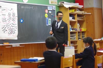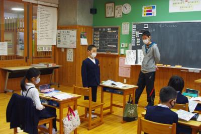 外国語活動 ハナ先生に質問したあと、ハナ先生からも質問され、日本語や英語で答えるなど、会話をしています。