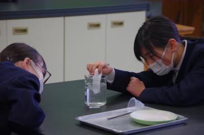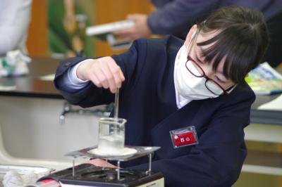 理科 塩や砂糖を水に溶かす実験をしています。水温と溶ける量の相関に注目しています。