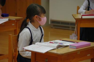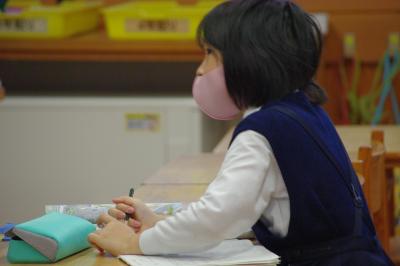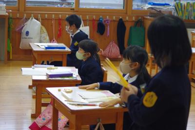 音楽 「ゆうやけこやけ」を歌います。自分がイメージする夕焼けを伝え合い、曲に合った歌い方を工夫して歌っています。