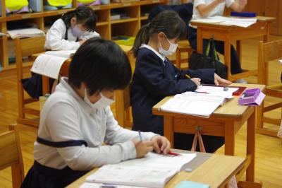 国語 古典「枕草子」を音読しています。自分が思う秋の風景と作者の思いを比較しています。
