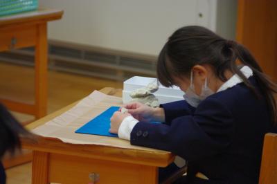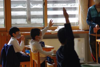 国語・社会 牛首つむぎについて学ぶため、白峰の白山工房を訪問しています。カイコから糸を取り出し、織っていく工程を見学しています。
