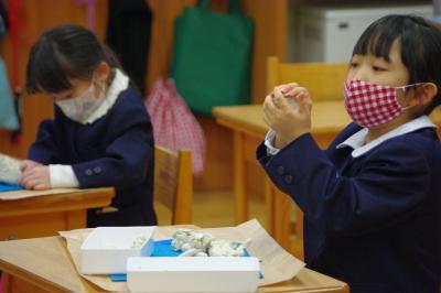 図工 粘土の仕上げとして、色を塗った後、ニスを塗っています。