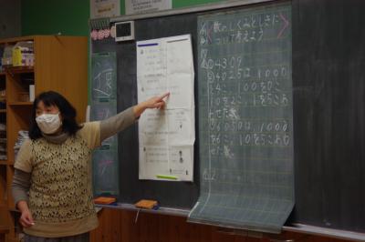 算数 1000以上の数について学んでいます。4309は千のかたまりが4つ、百のかたまりが3つというように考えています。